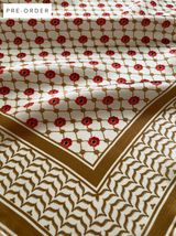 Our national flower in Palestine is the poppyseed. Using the traditional Palestinian Kefiyyah (Hatta) known to represent resistance, we have incorporated our national poppyseed flower into the fishnet pattern making this one-of-a-kind and unique print. Poppyseed flowers can be seen in fields across Palestine and incorporate the colors of the Palestinian flag.
