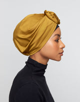 Our Satin top-bun turbans are made from our specially sourced Japanese cupro-blend allowing for breathability and comfort. Pre-made and easy to slip on for an elevated look in a matter of seconds. Whether you wear your hair down or prefer it tucked in we have two size options. For a better fit, there is a back adjustable tunnel with ties for size S and back elastic tunnel for size M. We recommend size S for those who plan to wear their hair down, have short hair, or thinner to no hair. We recommend size M for an average size bun (1 1/2"H x 3"W)