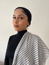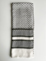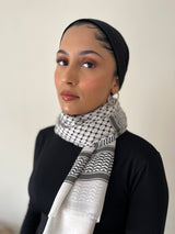 Our scarf is inspired by the traditional Palestinian Kefiyyah (Hatta) known to represent resistance. Made of the softest high quality natural fibers, we chose a lightweight blend that is 90% modal and 10% cashmere. Modal is a bio-based fabric that is made from spinning reconstituted beech tree cellulose and cashmere is the most luxurious wool that is both breathable and regulates our body temperature. When it's cold cashmere fibers hold in body heat and when it's warm, its fibers absorbs perspiration to keep us cool.