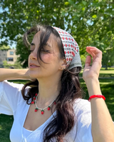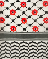 Our national flower in Palestine is the poppyseed. Using the traditional Palestinian Kefiyyah (Hatta) known to represent resistance, we have incorporated our national poppyseed flower into the fishnet pattern making this one-of-a-kind and unique print. Poppyseed flowers can be seen in fields across Palestine and incorporate the colors of the Palestinian flag.