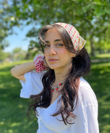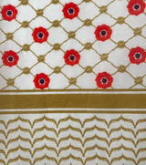 Our national flower in Palestine is the poppyseed. Using the traditional Palestinian Kefiyyah (Hatta) known to represent resistance, we have incorporated our national poppyseed flower into the fishnet pattern making this one-of-a-kind and unique print. Poppyseed flowers can be seen in fields across Palestine and incorporate the colors of the Palestinian flag.
